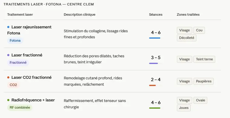 Des résultats visibles dès les premières séances : le laser Fotona, technologie de référence mondiale, stimule en profondeur la production de collagène et d'élastine, restructurant la peau de l'intérieur. Les rides s'estompent, le teint s'unifie, les pores se resserrent progressivement.